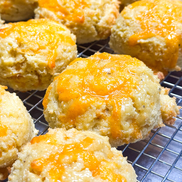 INGREDIENTS: Almond flour, sharp cheddar cheese, eggs, sour cream, butter, baking powder, pink Himalayan salt, black pepper, onion powder, garlic powder.