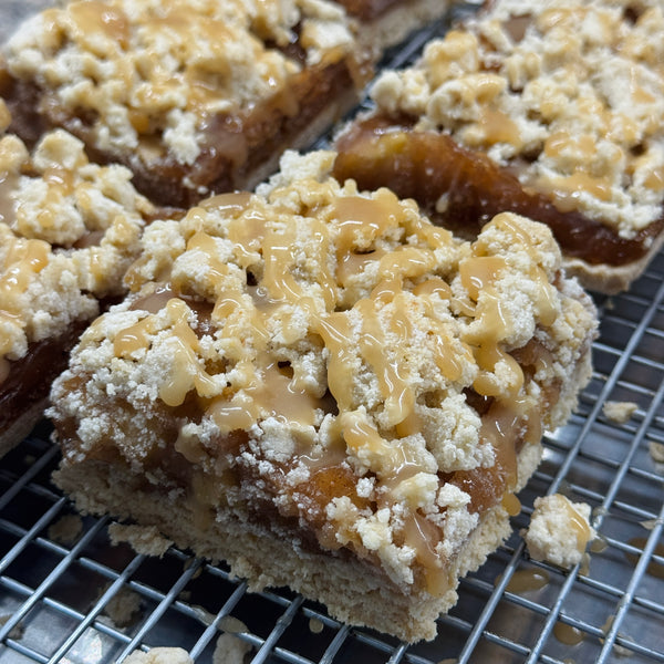 Soft, moist apple pie middle with a crumb topping and a soft cookie base. It's the taste of the season. A vanilla drizzle tops it off.
